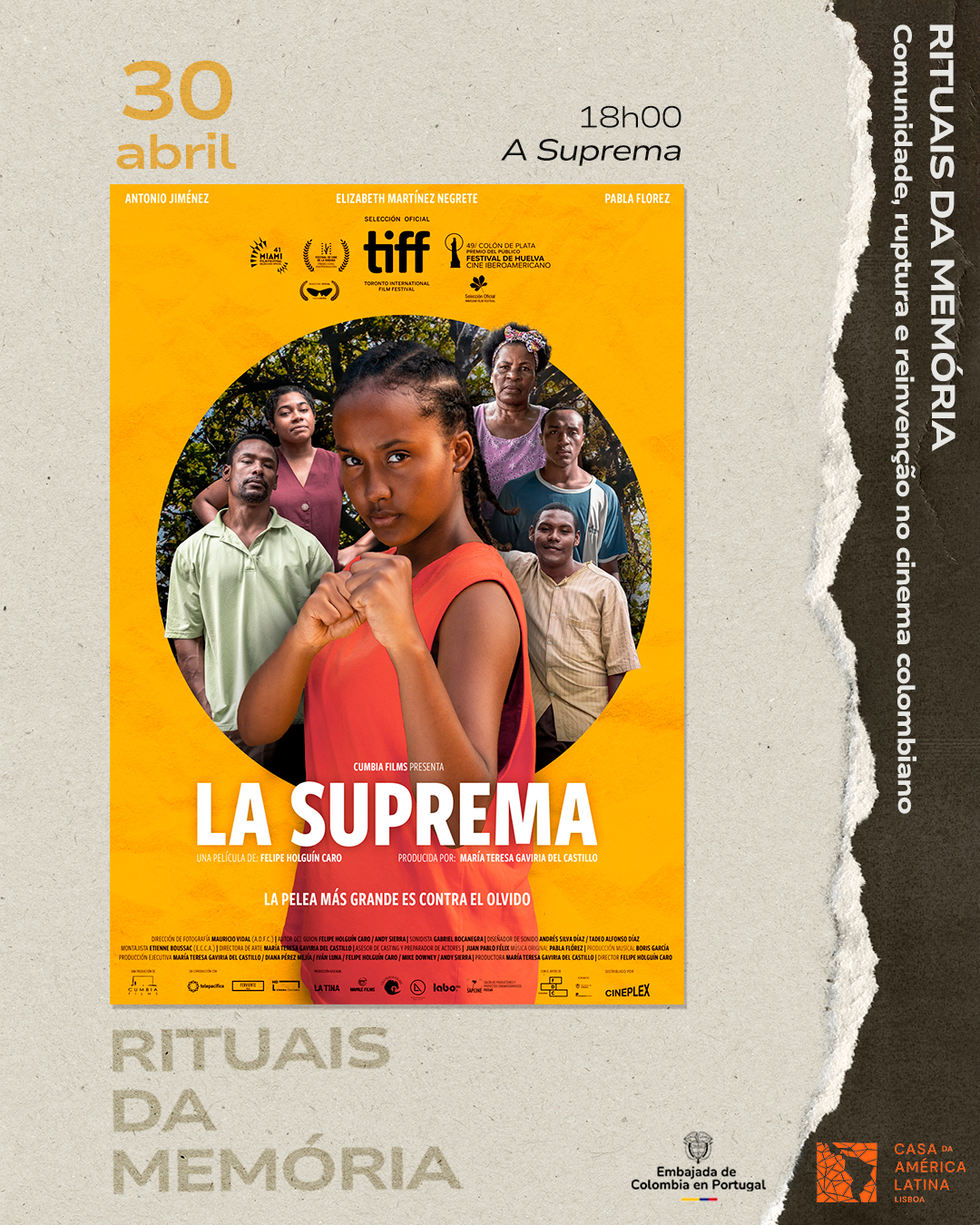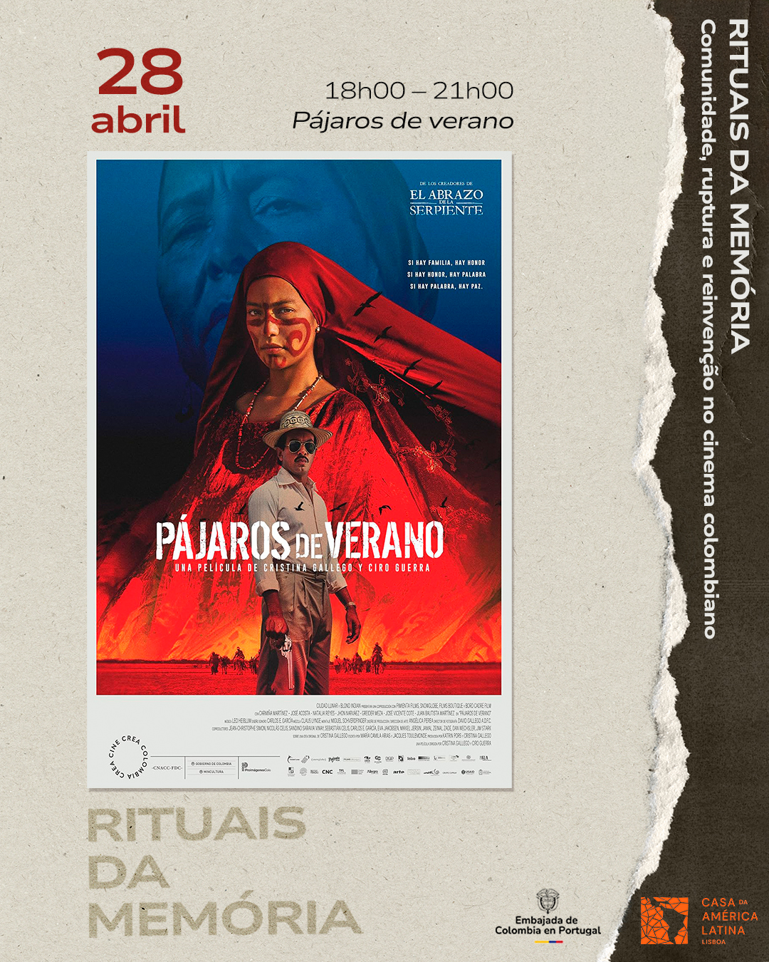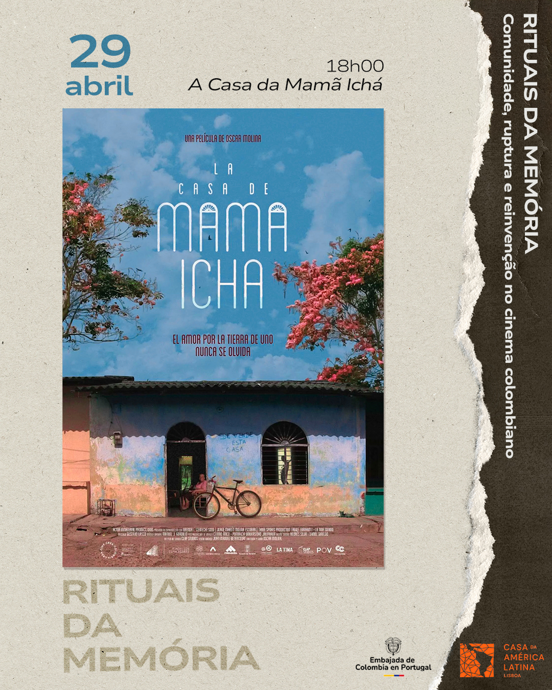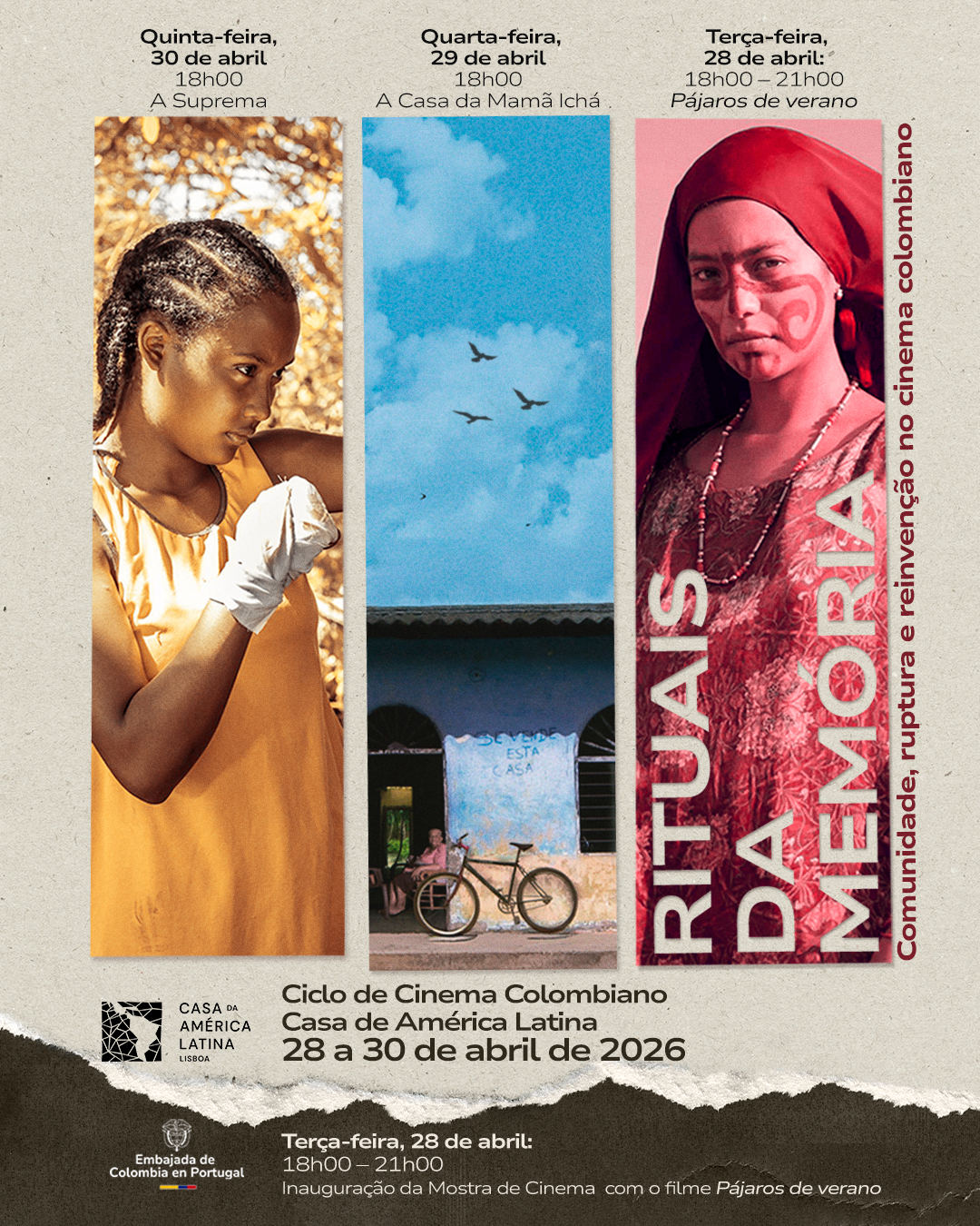 De 28 a 30 de abril de 2026, a Casa da América Latina acolhe o ciclo de cinema colombiano Rituais da Memória.