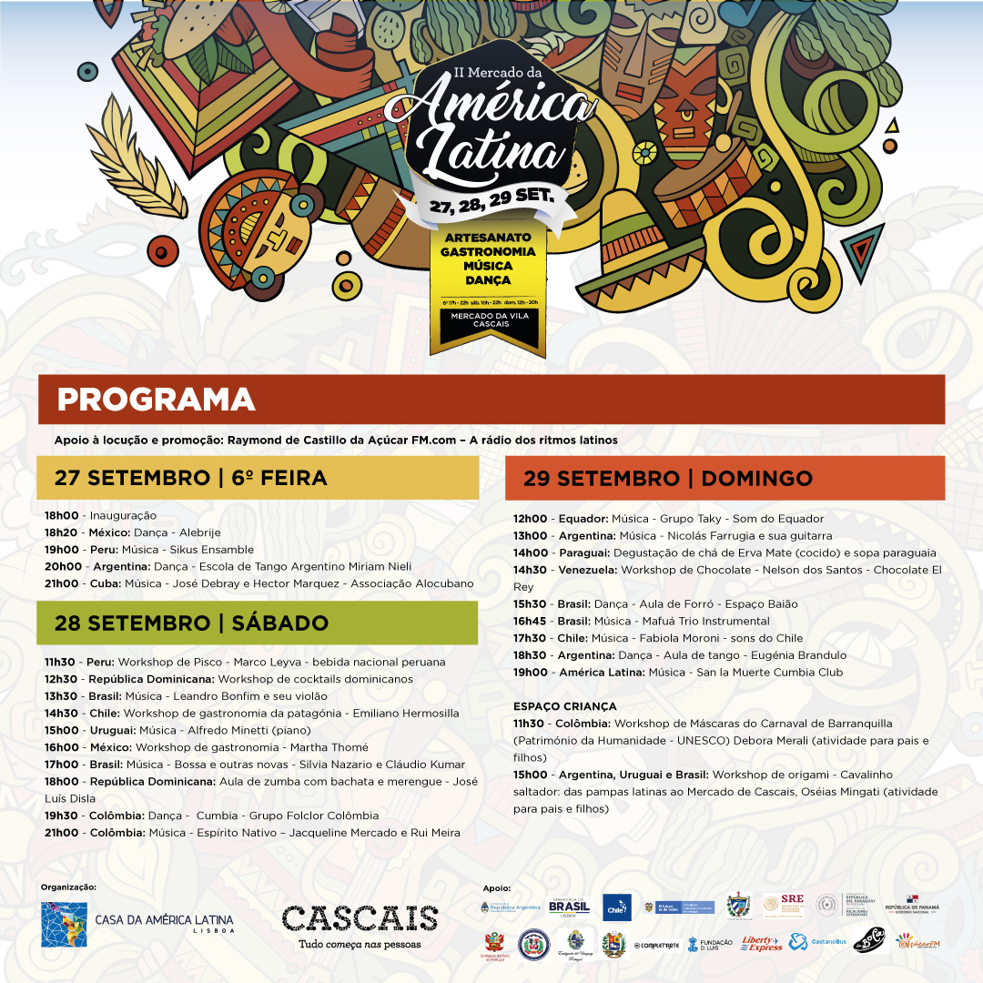 Naquele que se prevê ser novamente um ponto de encontro dos apaixonados pela cultura latino-americana, o Mercado da Vila de Cascais recebe de 27 a 29 de Setembro o II Mercado da América Latina. Organizado pela Casa da América Latina e pela Câmara Municipal de Cascais e apoiado pelas Embaixadas latino-americanas radicadas em Portugal, este mercado pretende dar a conhecer o espírito empreendedor desta região através da sua diversidade cultural, onde a música, dança e gastronomia de países como Argentina, Brasil, Chile, Colômbia, Cuba, Equador, México, Panamá, Paraguai, Peru, Republica Dominicana, Uruguai e Venezuela se farão representar pelas suas comunidades que escolheram Portugal como casa.